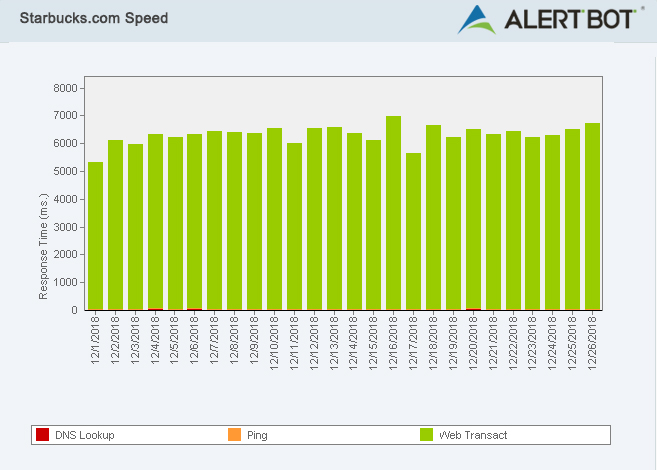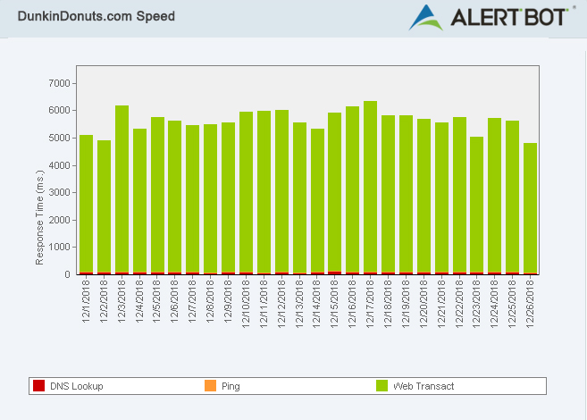 To test their website performance, we used AlertBot’s external website monitoring system and its TrueBrowser™ technology to monitor both DunkinDonuts.com and Starbucks.com from December 1st through Christmas Day, 2018. Given the notoriety of both establishments, we expected their performance to be as strong as their brews, and we weren’t disappointed.